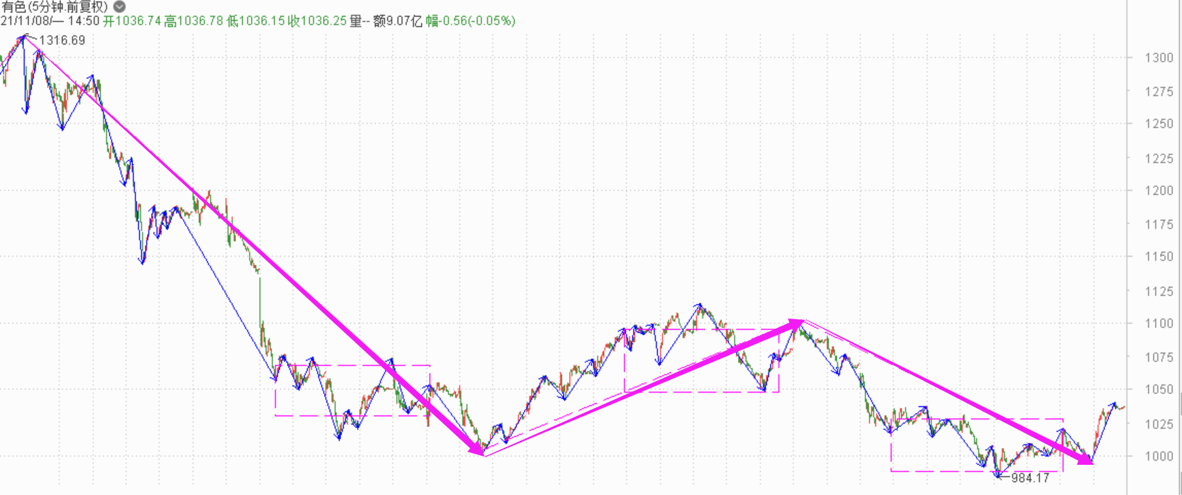 上图是有色板块最近的走势图。可以看出来它的结构上和上证完全相同。三段五分钟的盘整,不过节奏上比上证快了一步,周五就完成了一笔离开段,今天板块的大涨,可能表示开启了五分钟向上走势,但是也不确定,因为今天的反弹只回到了中枢的上沿,并没有进一步向上突破,理论上这个位置应该减仓的。