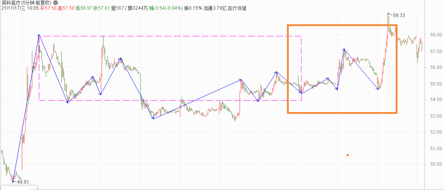 瑞新的操作是参照了前天抛掉的英科医疗,可以看到两个走势基本一样,唯一的区别就是,英科5F中枢后的上冲没有突破前高,所以后面的上冲拿着放心一些,而瑞新已经突破前高,所以上行走势可以随时结束。当然,这些都是经验,而不是理论保证的,所以心态上就不稳定了。