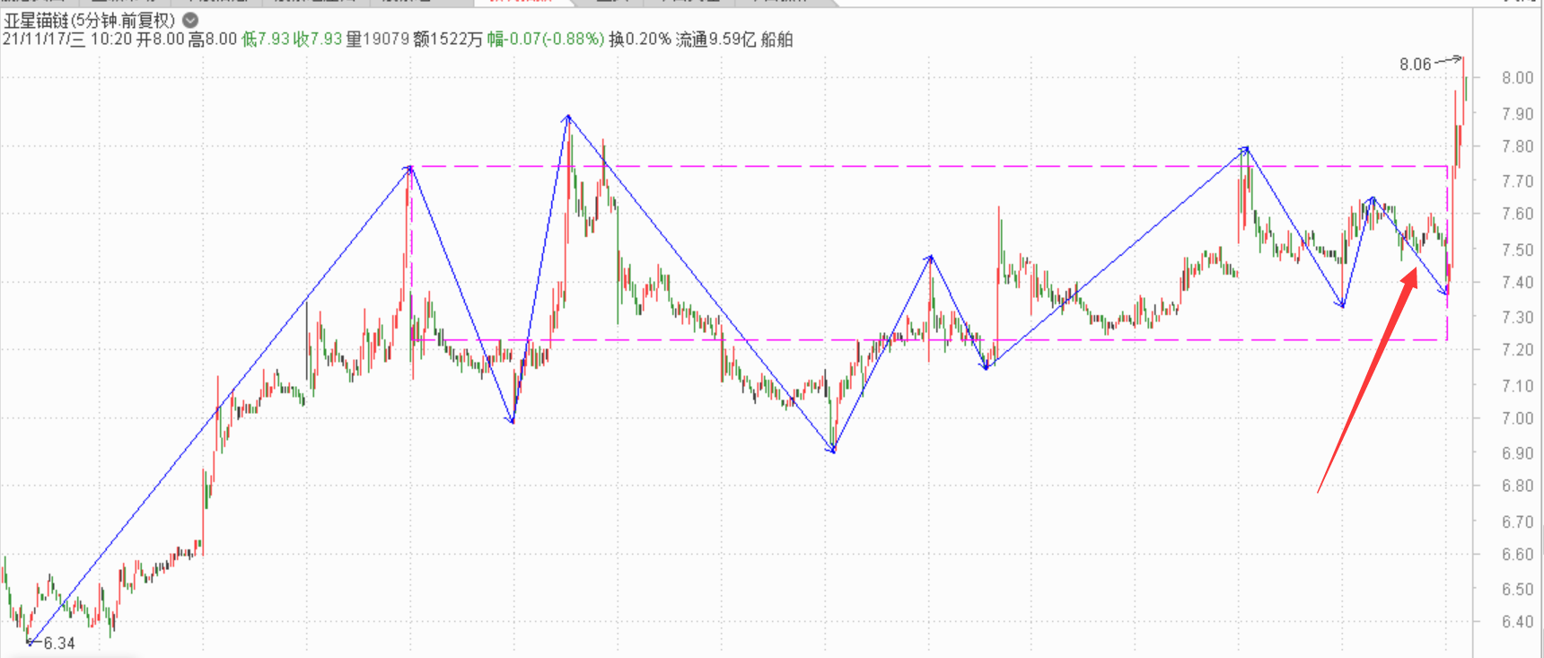 亚星锚链,底部起来的第一个5F中枢构建中,昨天收盘的时候由于最后一个向下线段未能完成,所以昨天不是买点。但是今天它大概率会向下跌破昨天下午的低点,完成最后一个向下线段,从而形成5F的二买。