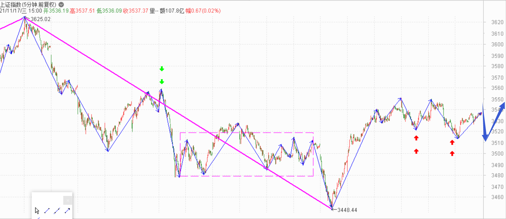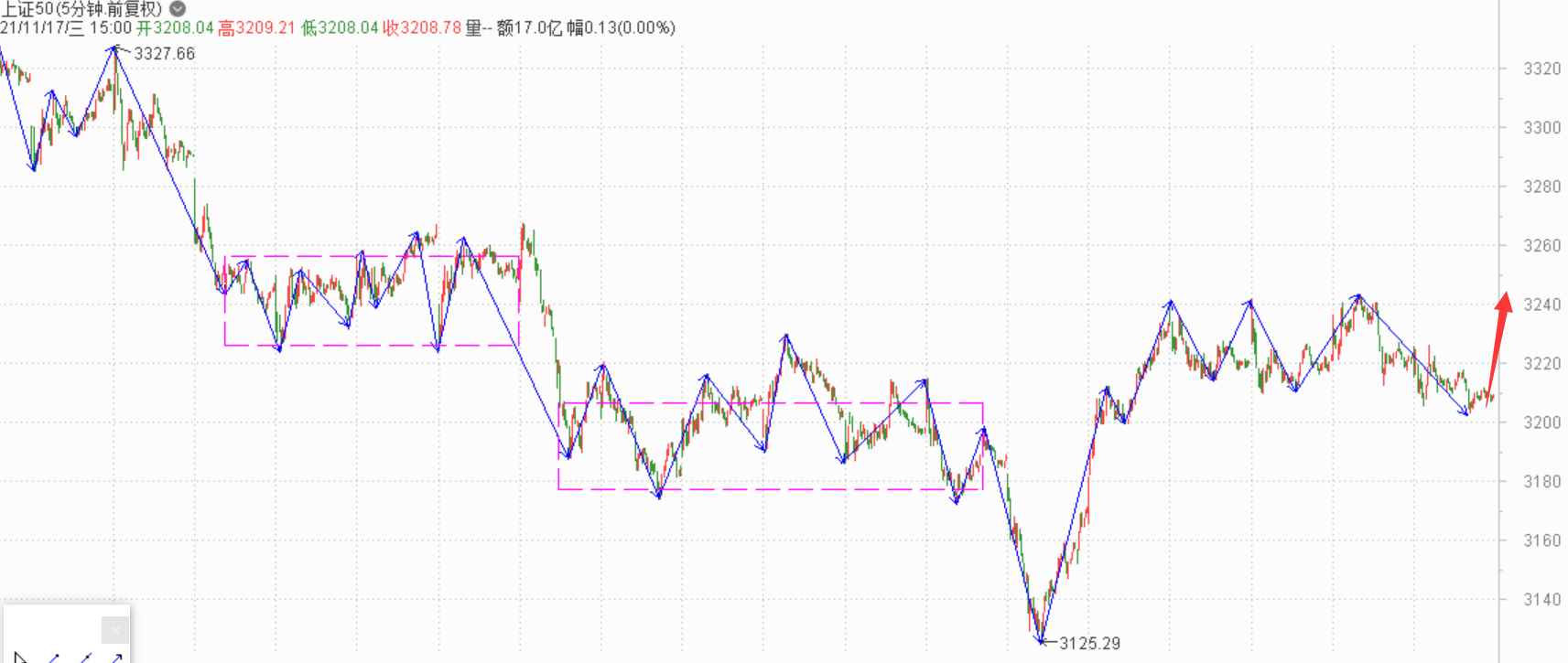 上证维持震荡的观点不变,由于今天指数距离中枢上沿还有些距离,明天开盘应该是继续向上运动,然后不能突破中枢再砸下来。如果明天开盘不是向上,反而直接向下的话,那这个中枢有些太弱了,高点一个比一个低,低点也一个比一个低,除非后面扩展中枢完成后大力度向上突破,否则这段反弹有可能直接结束,然后就向下跳水,到时候注意下吧。