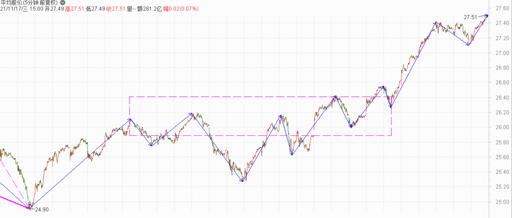 现在看,由于平均股价线段级别盘整背驰,明天大概率会向下回调,除非明天开盘直接高开高走,但希望几乎为零。明天更可能的走势就是,由于上证50的上拉,上证指数向上,打到中枢上沿,但是平均股价下行,个股大部分回调。