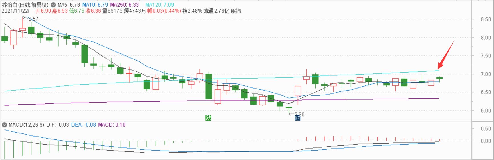 今天清仓了乔治白,周五午盘进的,赚了不到一个点。以后这种小市值,弱势个股禁止参与。这个股票弱势体现在两个方面,一是年线压制始终无法突破,二是日线MACD没上零轴。这些其实都不太重要,主要是它的市值太小了,流通市值才十个亿,每天成交额一两千万,这就意味着很容易本大资本控盘,散户很难玩过他们,最好的方式就是躲远些。