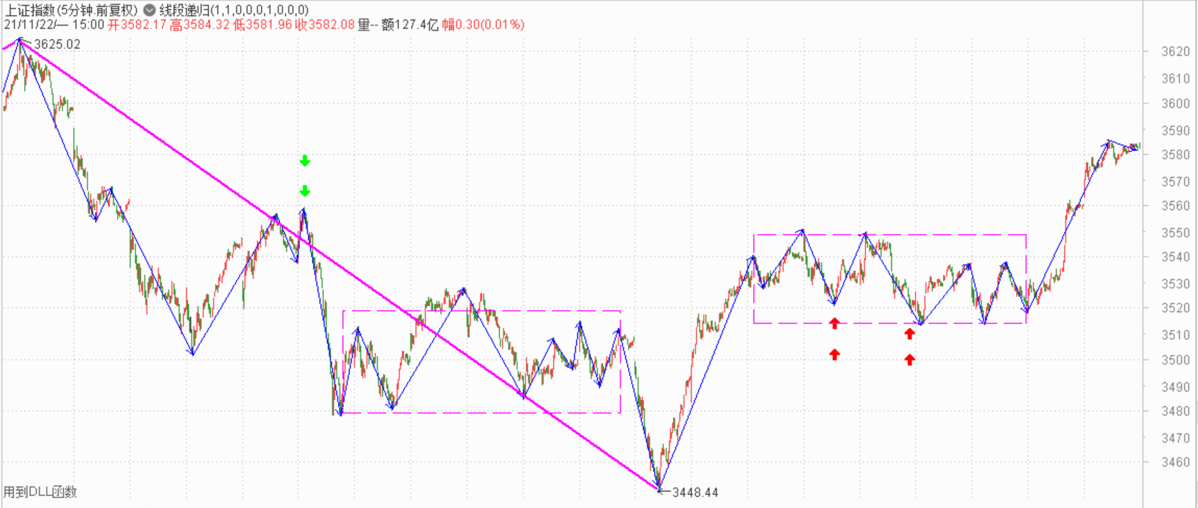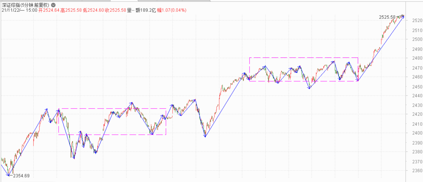 最近深证综指走的很漂亮,标准的五分钟级别的双中枢趋势上涨。由于这两天的上涨只是线段上的一笔,所以并没有趋势背驰,只要不发生小转大,后面大概率出现第三个五分钟中枢。后面的操作就简单了,持仓的等着拉升出现卖点;有买点的,可以放心买买买,不过最好是下午。一旦第三个中枢出现,如果发生趋势背驰,随时准备清仓走人,不过这至少是下周的事情了。