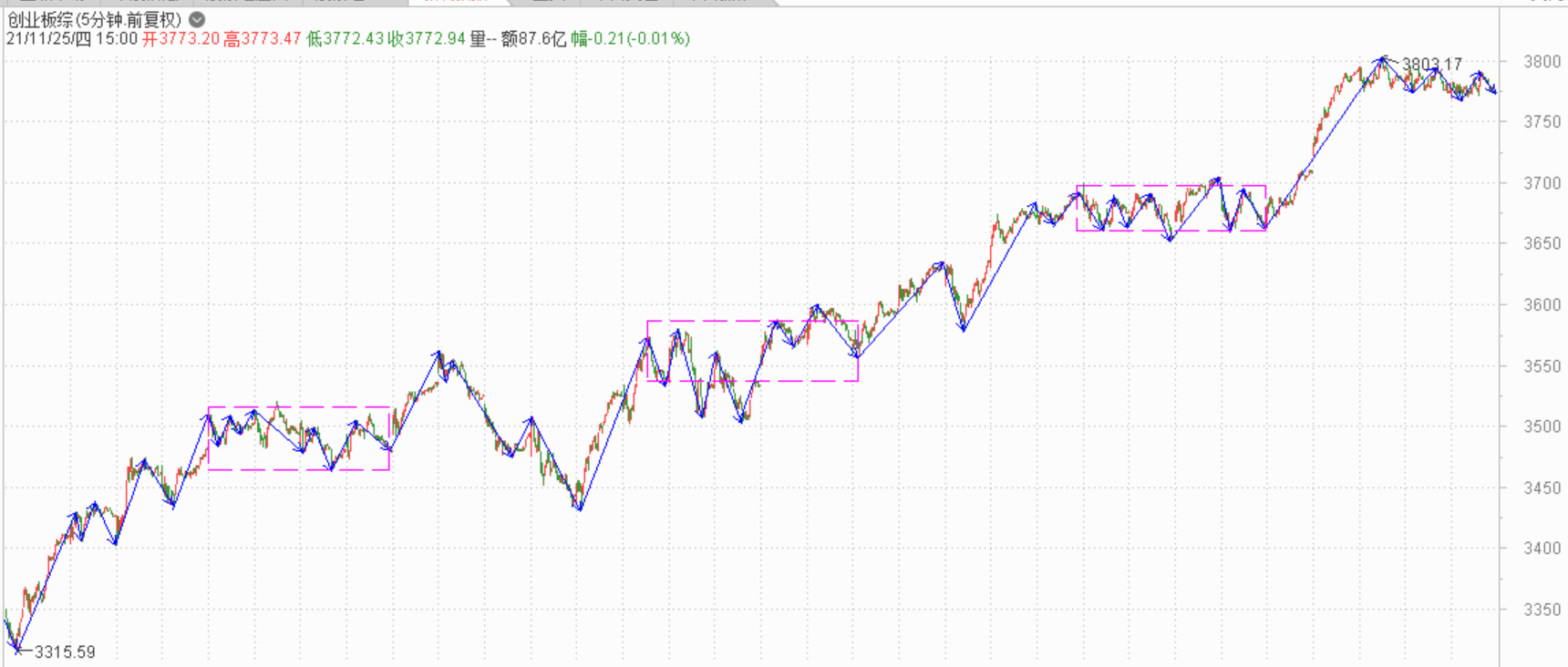 第二种是给个逃命机会,那就是顶背驰。一笔或者三笔向上突破中枢,但是力度不足,出现五分钟三买后发生趋势背驰,然后就是向下跳水了。这种走势比较坑人,突破了新高,横盘一天,然后大概率一根大阴线砸下来。