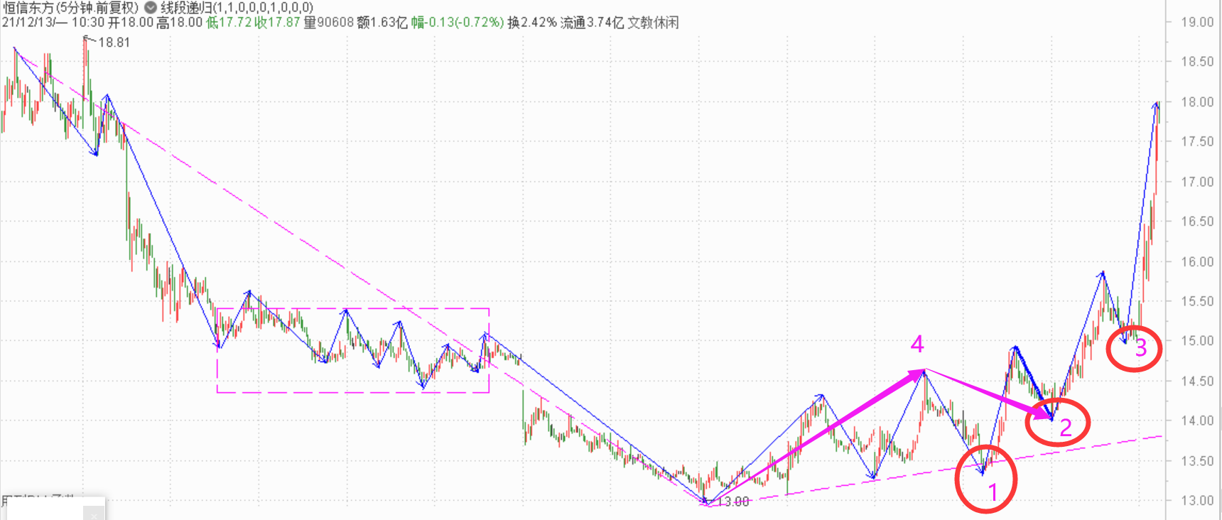 上图是恒信东方近期的走势图,元宇宙概念。上周元宇宙出现了三十分钟级别的二买,而恒信东方经过一段时间的调整,出现了三十分钟级别的三买。图中的最低点在板块买点出现前已经发生,我是在4点出现后加入的自选。图中最好的买点就是1点,这里是一个五分钟盘整下跌的一买点,因为4点是个三卖点。这里的1点不是最低点,但是按结构,这里确实是一买点。当时这个点看到了,但是因为是开盘,没有进,如果参照趋势线的话,这个点还是比较安全的。