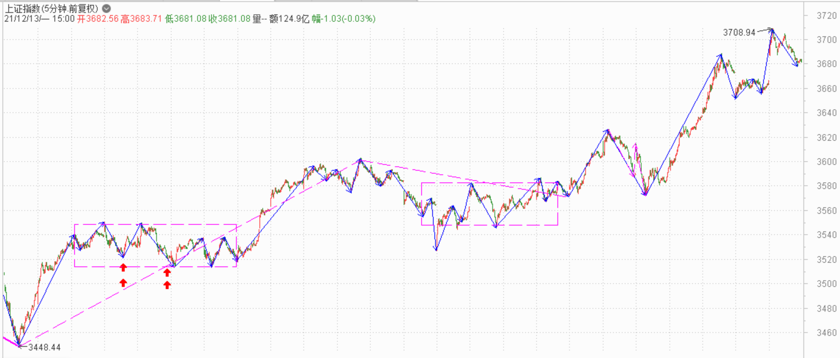 相对的,如果明天不能向上直接突破3723,反而是在今天高点附近发生盘整背驰,这种走势就不好看了,因为背驰后一旦跌下来,就可能形成五分钟扩展中枢,那么意味着这段上涨就处于随时完成状态,除非后面一根大阳线强势突破,然后演化成上行趋势,否则这轮上涨有可能就结束了。