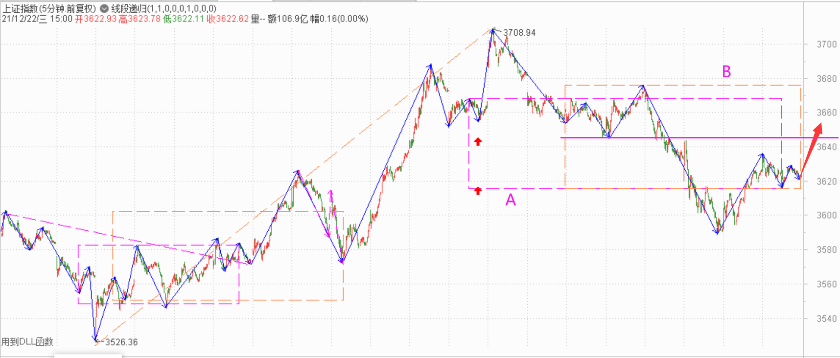 另一种视角就是以最近的两个高低点来看,一是前面的低点3526,把这个点作为五分钟上行走势起点,橙色框作为操作中枢。最近的高点3708作为上行走势的结束点,同时是下行走势的起点,后面的橙色框作为5F中枢,那么这个中枢还没完成,还差一笔上。不过这种走势有个要求,就是明天的一笔上必须打回前面的低点3645,如果明天指数磨磨唧唧的打回这里,然后线段内部盘整背驰,那么这种走势的可能性就很大。
