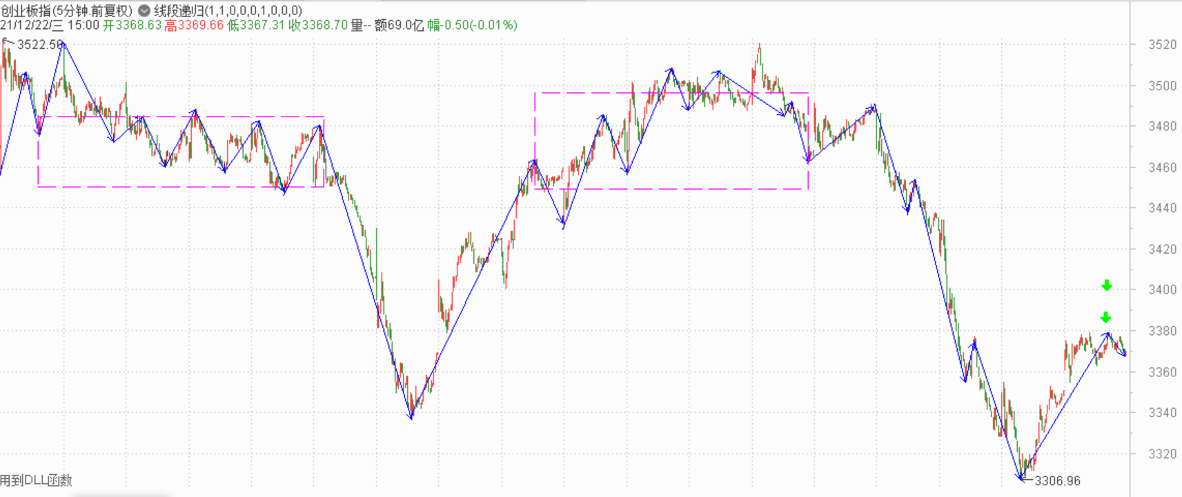 上图是创业板指,今天看起来非常不错,高开高走,结果最终指数构只建出一个五分钟三卖点。不过这个三卖点有些伪三卖的意思,因为后面并没有大幅度下跌,但是如果明天再一笔上涨,从而与前面的线段形成三段盘整背驰,这个背驰点也将是一个三卖点,并且有可能是真正的三卖点。鉴于指数这三种分类,下跌和上涨比是二比一,安全起见,就大幅度减仓了。