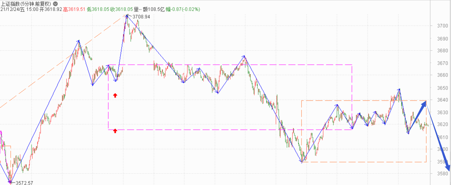 现在上证存在的危险点就在于:周一开盘后,如果一笔向上的反弹不能强力突破图中橙色标记的中枢,那么这里将是一个五分钟的二卖点,后面向下跳水的概率非常大,反过来这个位置是我买股票的点位,后面的力度可想而知了。周一务必注意这点,千万不能追高,做T最好也不要,除非大幅度突破这个中枢,然后回踩形成一分钟三买,确认上行走势了才可以考虑补仓。