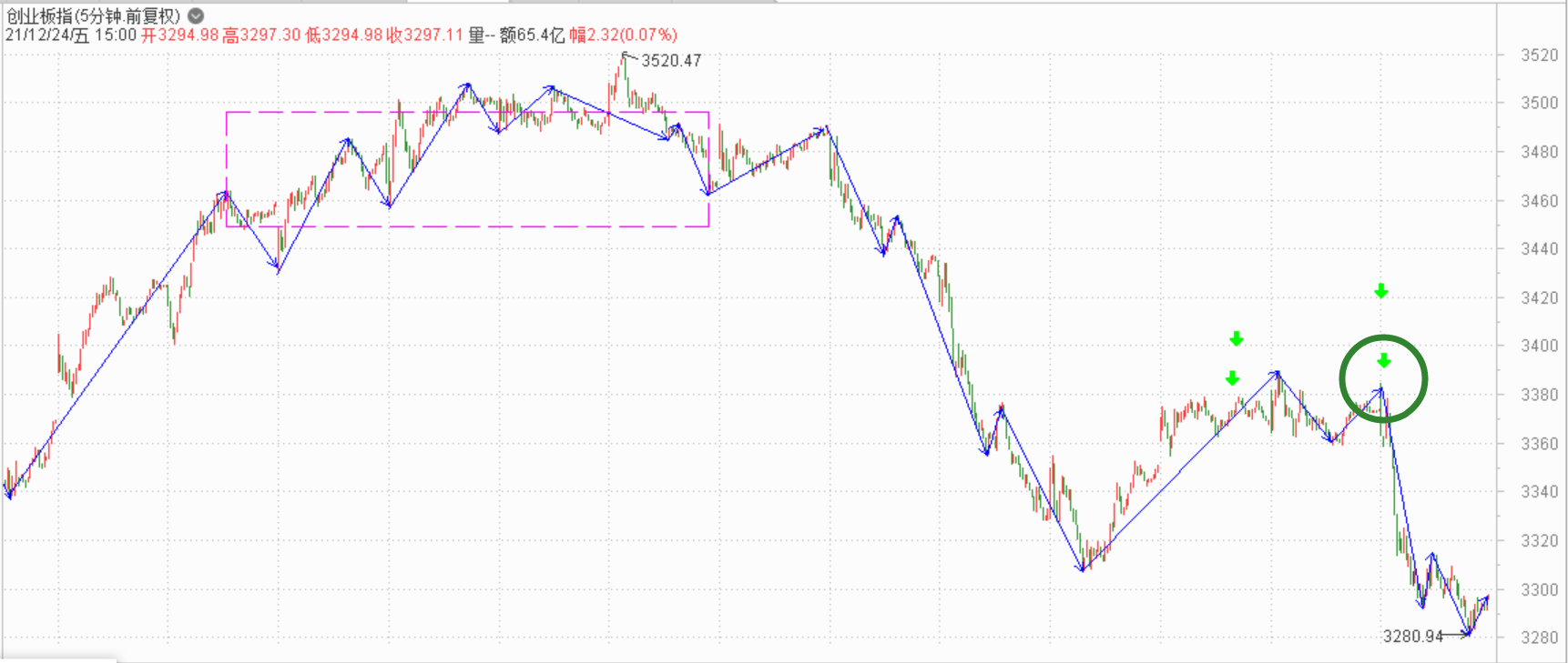 前天的分析文章指出,昨天创业板有可能构建出真正的五分钟三卖点,如果成立那么后面会有新低。昨天尾盘这个卖点出现了,而我竟然给忘了!昨天尾盘买了五支个股,都算是在安全的买点上,今天开盘集体上拉,但是没多久就转头向下了。如果记得创业板的三卖点的话,今天创业板高开低走的时候就应该立即走人的,但又是犹犹豫豫的,最终平均亏损一个多点走了。