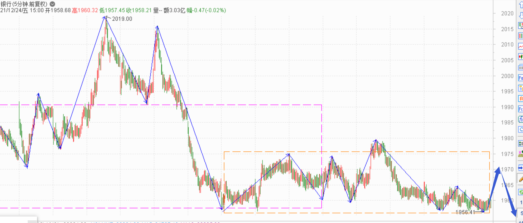 上图是金融股的另一个权重银行,从高点看的话, 这里也是在构建一个五分钟扩展中枢,并且差一笔就完成,如果完成后不能向上脱离这个中枢,这也是是一个二卖的位置。综上,周一是一个非常关键的时间节点了。