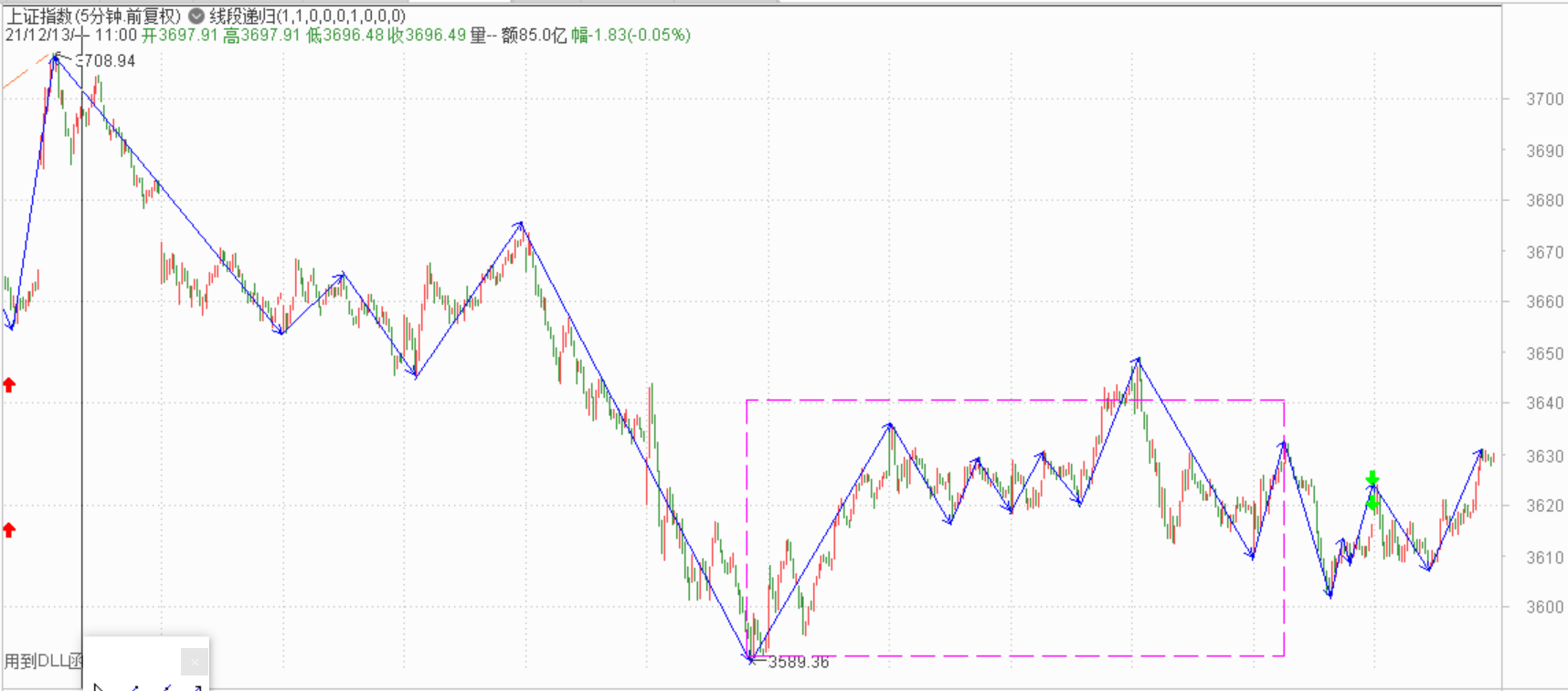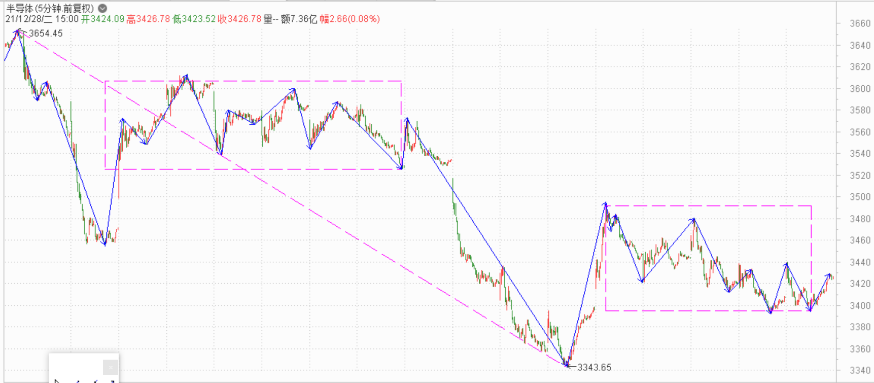 从现在的走势看,由于今天没能跌下去,反而是向上运动,以最近的中枢为参考,今天收盘位置处于中枢上沿,所以明天的指数有两个选择:一是高开直接突破这个中枢,这就基本确认后面会开启一波五分钟的上行走势;二是明天开盘后上涨无力,或者是低开,这就意味着指数会向中枢下沿运动,跌破3600也有可能。但不管哪种,基本没有跳水的风险了,也就是一天跌个两三个点的情况不会出现了,更多的是涨涨跌跌的震荡。