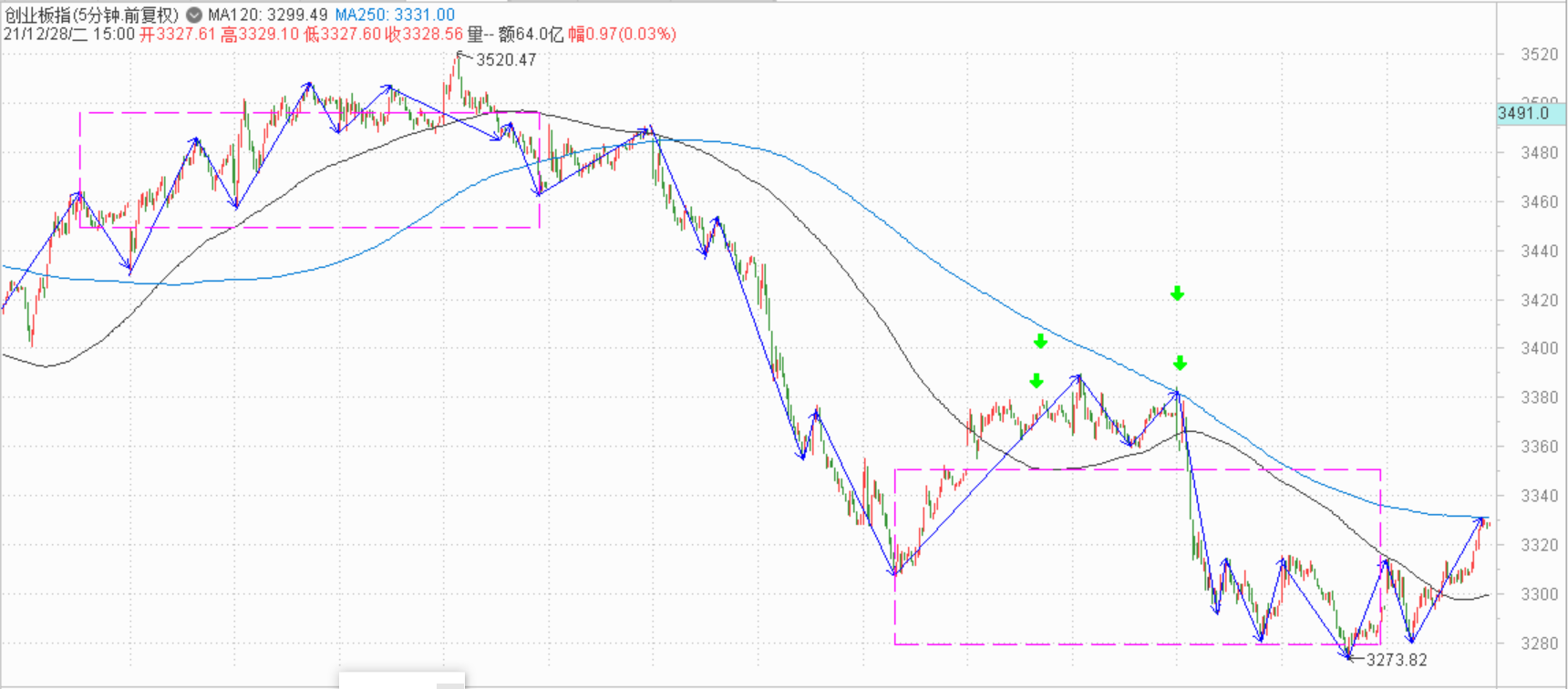创业板今天涨了一个点,但是没什么意义,也是中枢震荡,今天收盘位置处于均线的压力位,所以明天不能高开或者开盘急拉的话,大概率向下运动了。同样的,由于这轮下跌已经存在五分钟扩展中枢,并且有一笔离开段,所以这个下跌走势是完成的。明天如果开盘上涨或者直接高开,然后回调不破3320附近,创业板有可能出现五分钟扩展三买点,这个是一个很好的看多信号,后面开启五分钟上涨的概率就非常大了,明天要注意一下。