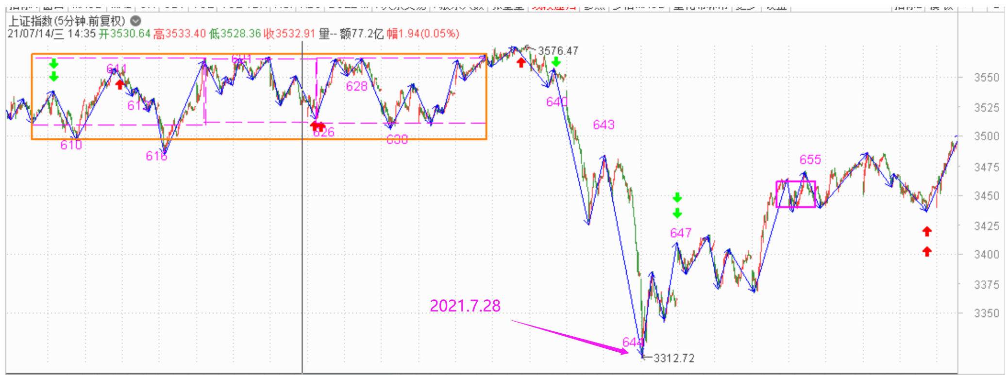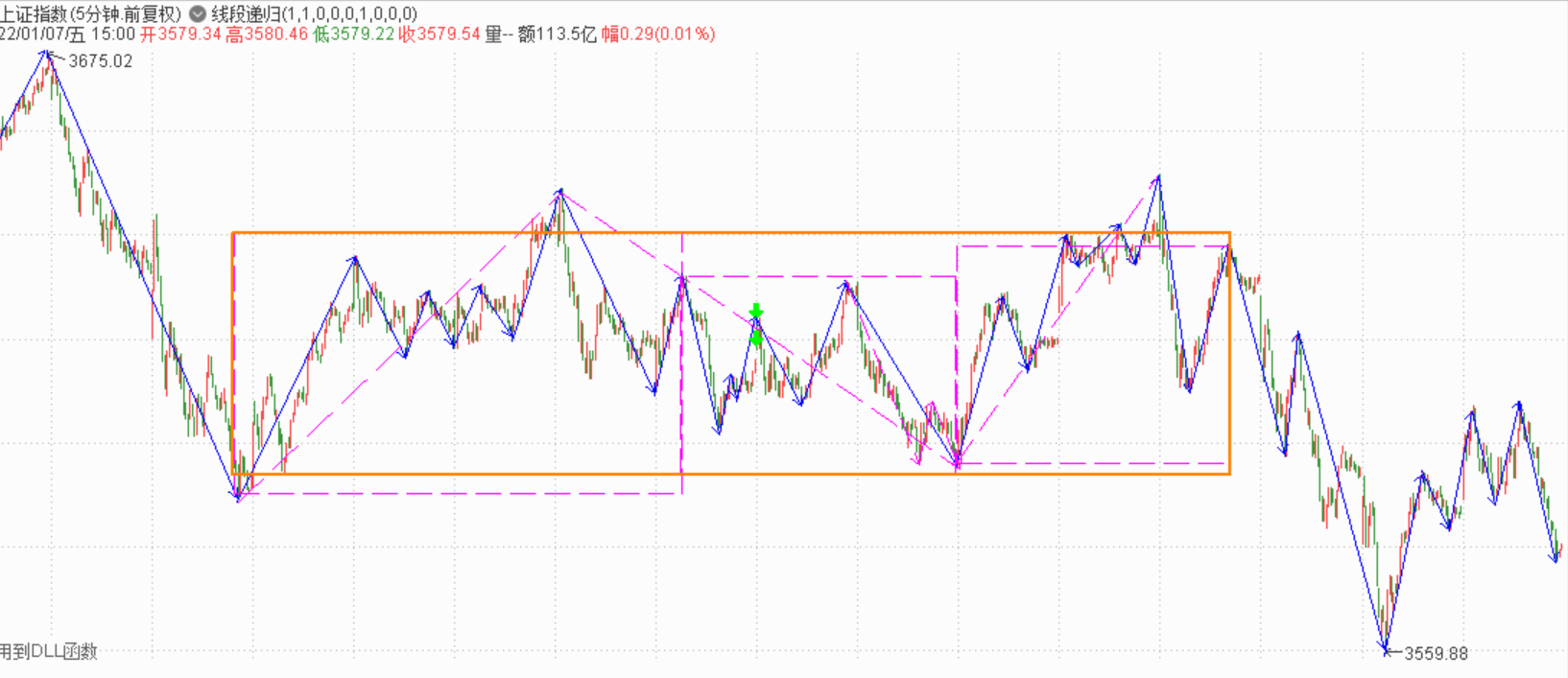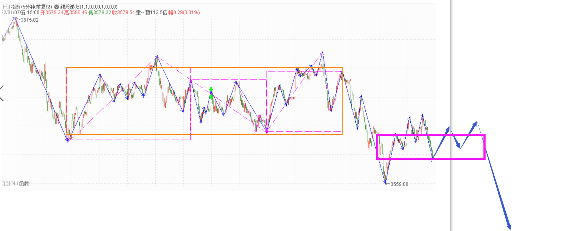 当然,走势大多时候都是不正常的,所以要是后面直接涨上去也不用意外。区分上行走势和下行走势的关键点就是线段数目。图中框起来的蓝色五分钟扩展中枢,以下行中枢视角来看,还差三笔线段;如果以上行走势的视角来看,还差四笔线段。下周盯盘的时候,在三笔向上线段完成,看看个股有没有减仓和清仓的结构点位,如果有那就清。然后观察指数向下的一笔回调,如果像图中那样直接砸下来,基本确认下行走势了。如果三段上涨完成后,第四段下跌力度很弱,那就大概率是中枢震荡,那就是从3559开始的上行走势启动,可以加仓了。总之,是多是空决定于三段后的走势力度。不过,另一种极端情况是,如果下周一开盘直接开在3559下面,直接清仓吧,百点长阴没跑了!