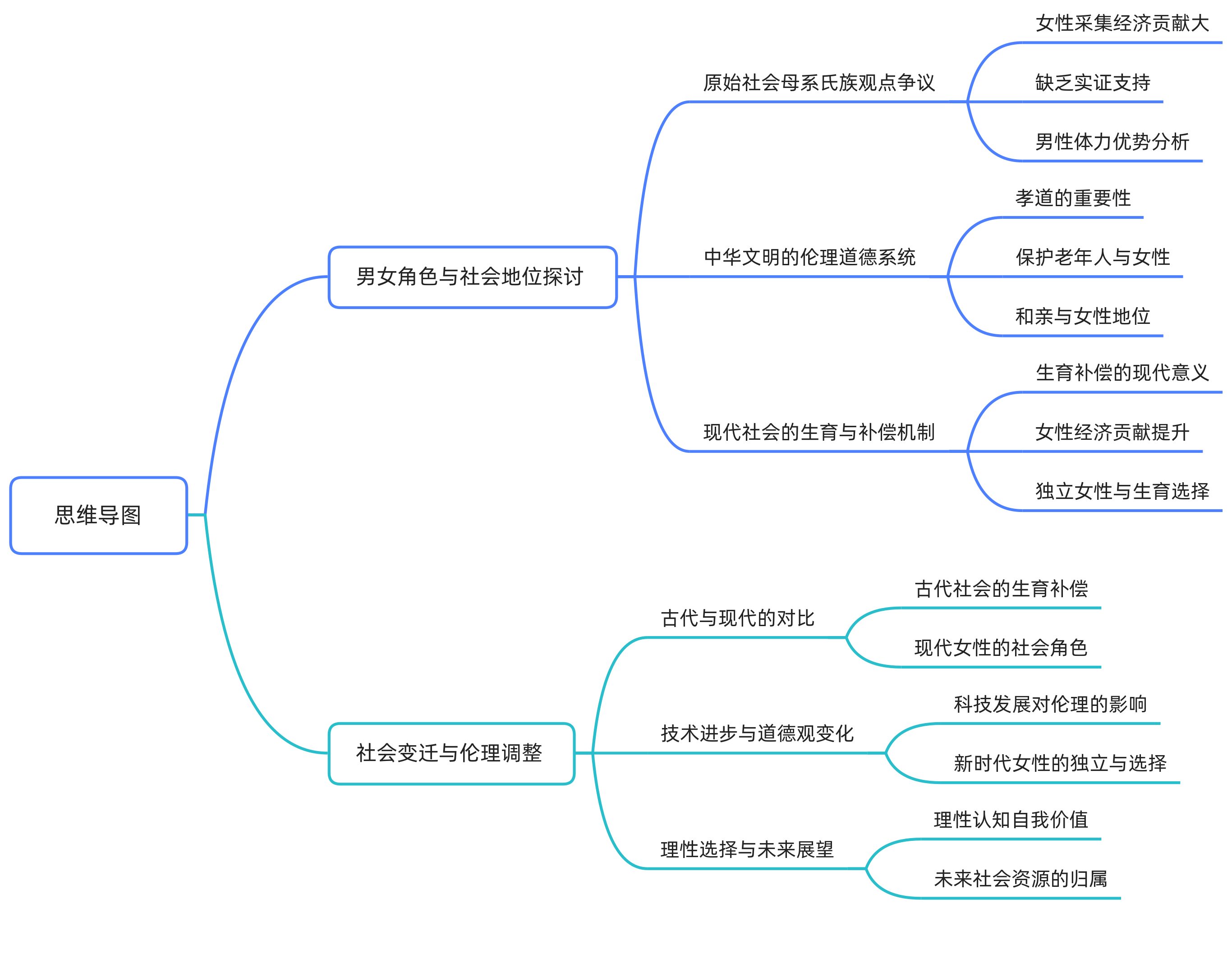 中国的古人很早就清楚地意识到了男女生产能力上面的差异,以及造成这种差异的原因是由于女性要负担生育这件事情。所以我们对女性的生育进行了一个补偿。就是当你生育了一个孩子,这个孩子就有义务保护你,尊重你,对你提供回馈。这个就是对女性生育上面的一个补偿机制。