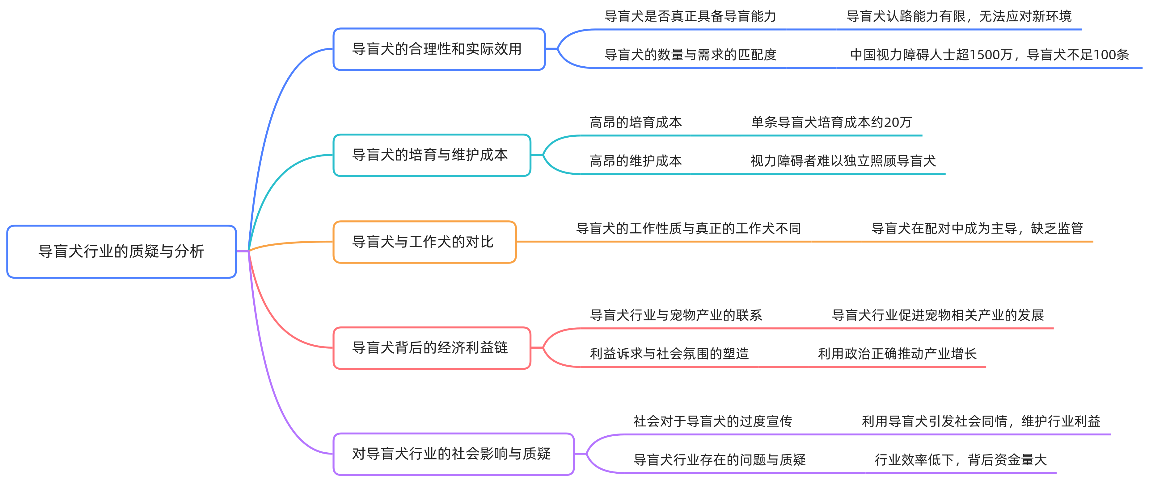 导盲犬犬陪伴的是一个基本上在日常生活当中有部分失能的盲人,一个残疾人。所以他导盲犬在这个配对当中变成了主导。而作为一个狗,在人类社会里面它没有主导的能力。说老实话,和正规的工作犬他的负担都是很重的。但是导盲犬就算他做的非常的完美,也只是服务了一个人而已。而他的这项服务实际上做的并不好,也有大量的电子设备可以去替代它,偏偏成本还非常的高。所以工作能力也好,工作成本也好,导盲犬都是不能够胜任的。