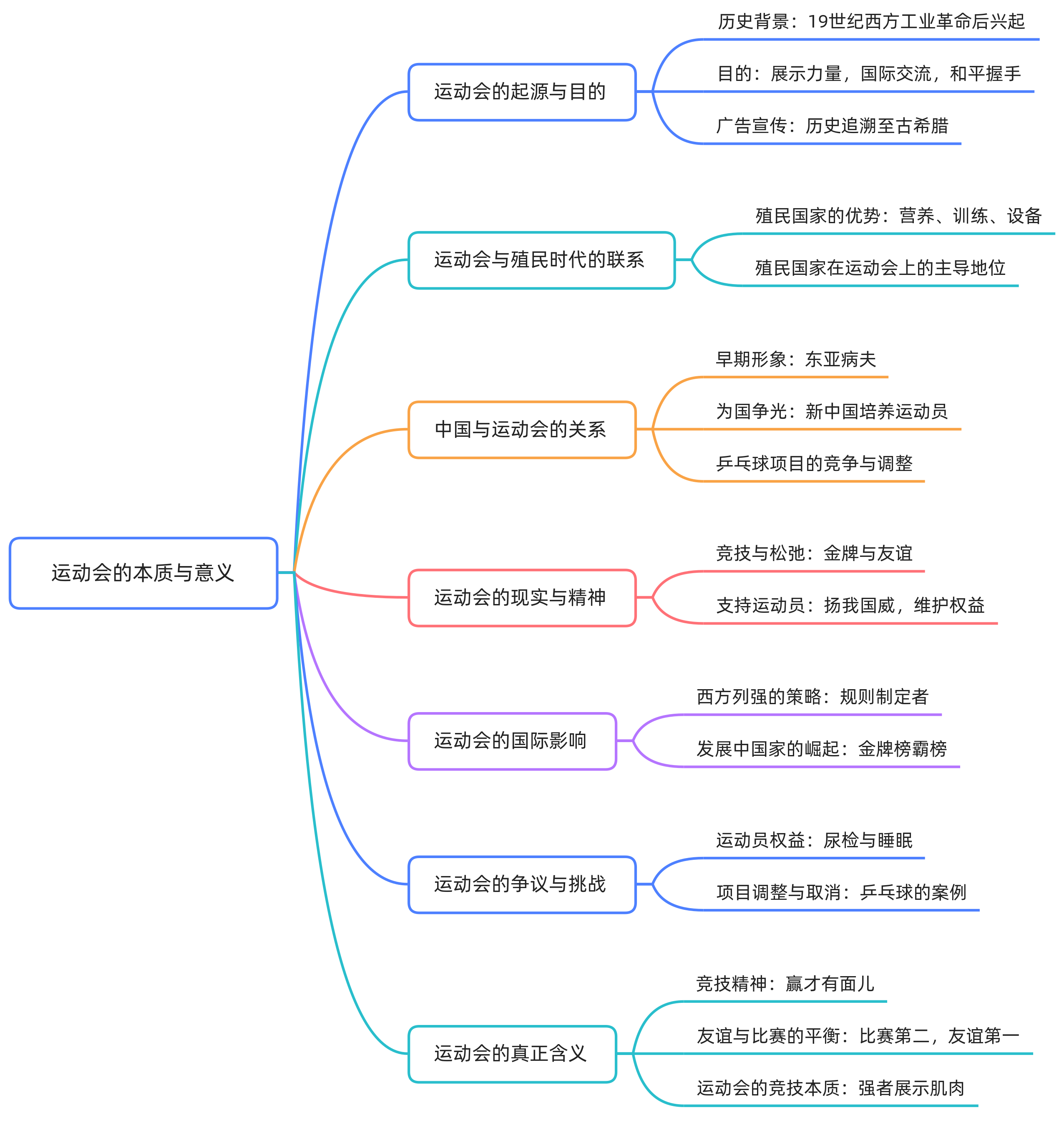 我们记得那个时候对这些艰苦努力训练出去打比赛的运动员是怎么形容的吗?他们叫做为国争光。为国争光这四个字一直到几年前,咱们还在普遍的在用它,就是因为参加这种国际性的赛事,就是要洗清我们脑文字上那个东亚病夫四个字。我们得在国际的舞台上面去证明自己身强力壮,有竞争的能力,有聪慧、有体能。所以你说这个玩意儿叫做松弛,这跟松弛有什么关系?运动会是什么?运动会就是强者展示自己肌肉的地方,只不过就是不打仗而已。所以本质上面来讲,我们去看运动会他本身的诞生历史,你就知道了它其实是列强炫耀肌肉,耀武扬威的一个场所。