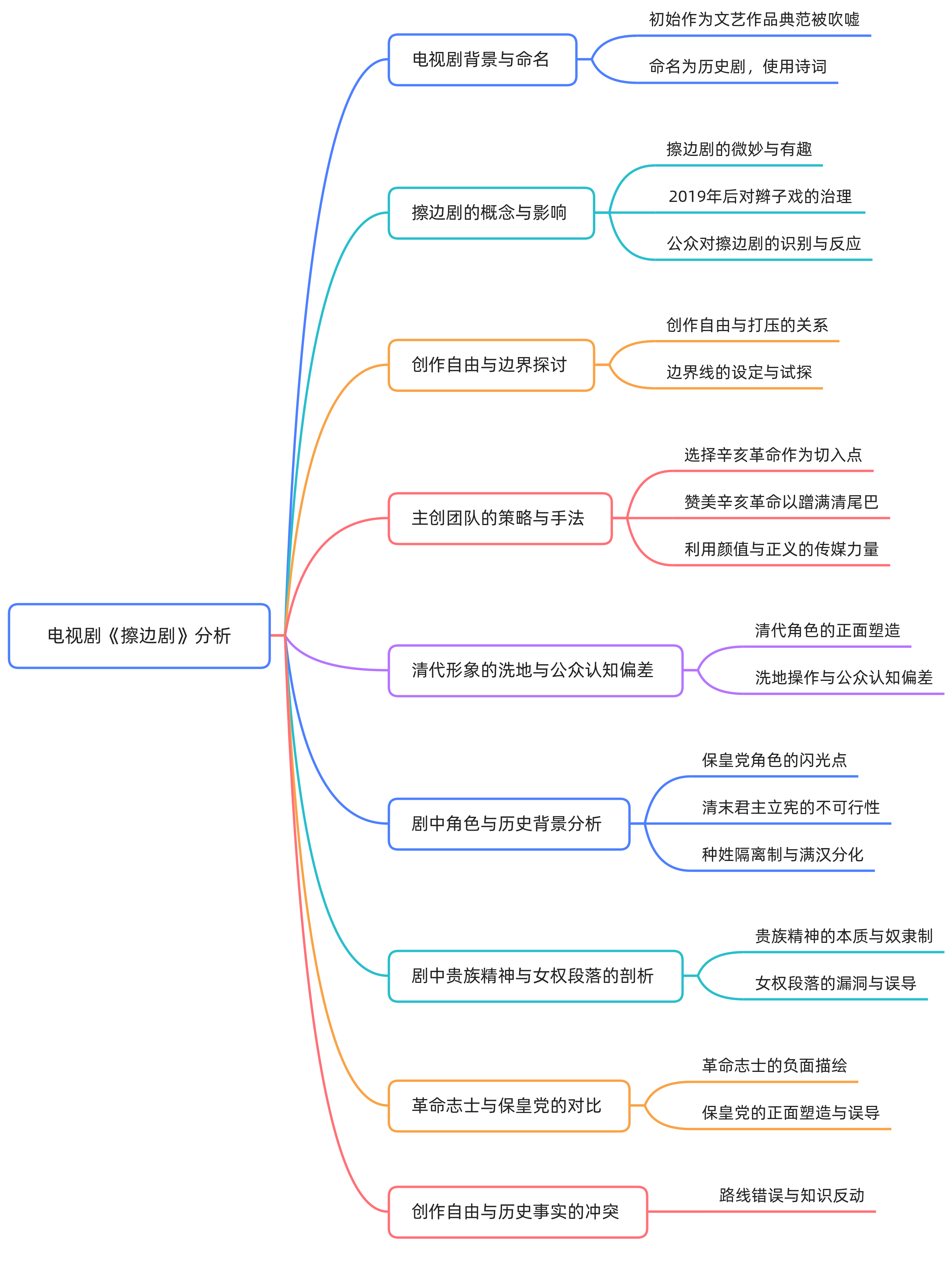革命志士放成了反派的时候,都看上去乌烟瘴气的时候,它依然是一个革命剧吗?所以界限放在哪儿?如果一个剧最后产生的效果是让人向往黑暗的时代,向往腐朽的过去,你总不能说它是正向的。但是这部剧的主创的群体很明显的非常的聪慧,非常的了不得。他在中间找到了某一条狭窄的夹缝,并且借由一些边边角角的借口,把一个完全违背历史事实和历史目标的东西硬给抬上来了。所以这就换到我们几十年前的总结语了,这叫做路线错了,知识越多越反动。
